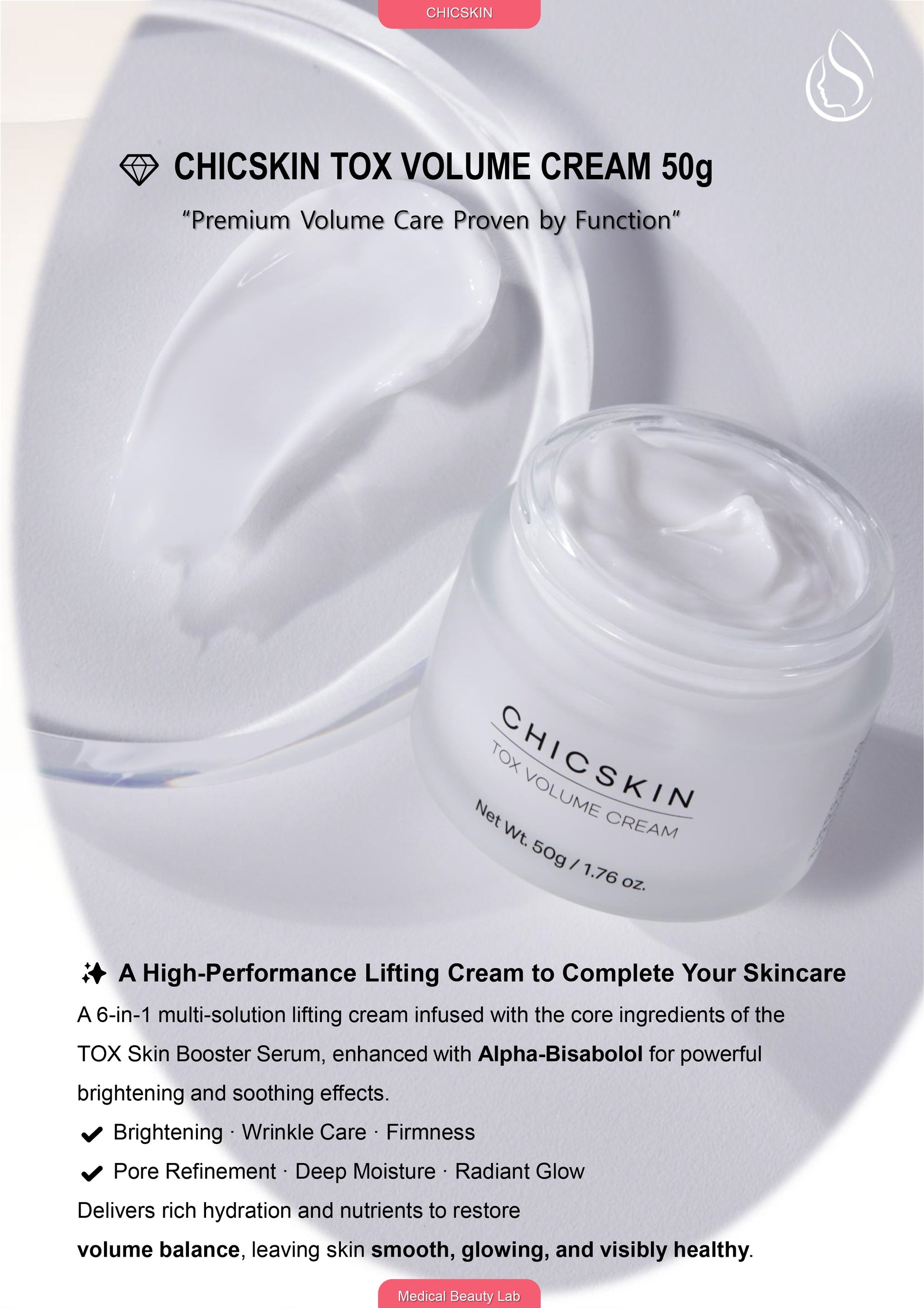 Elevate your skincare with the CHICSKIN TOX Volume Cream, a high-performance 6-in-1 multi-solution cream designed to restore lost volume, radiance, and resilience. Formulated with the core actives of the TOX Skin Booster Serum and 6in1 Ampoule, this luxurious cream is enriched with Alpha-Bisabolol for enhanced brightening and soothing effects.